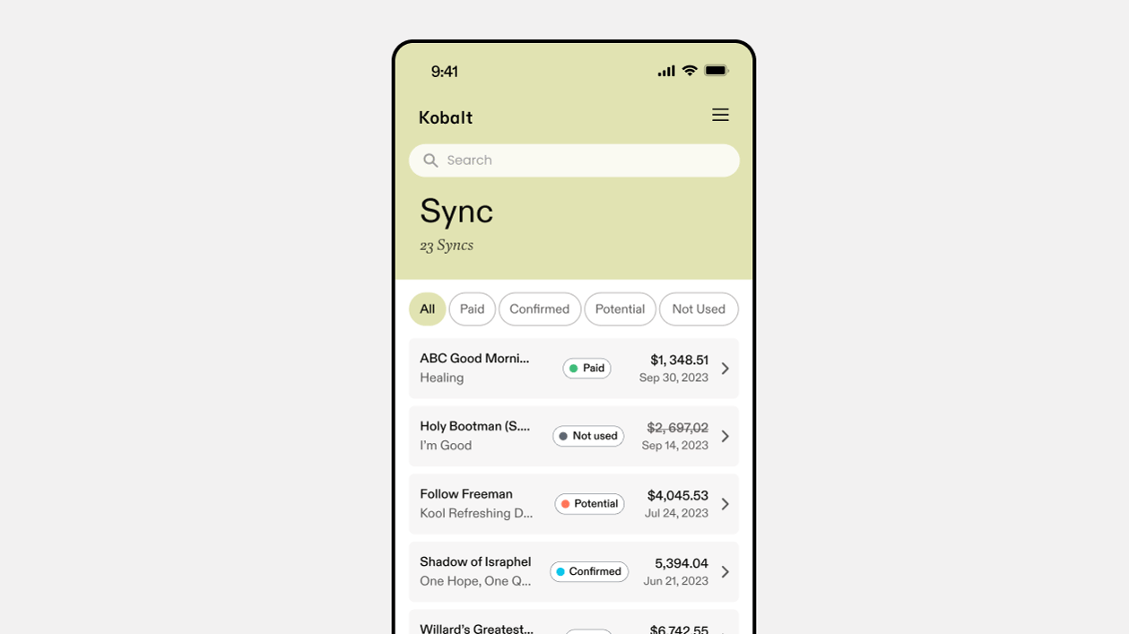 Keep your sync's by your side, and your hits on hand. Track your catalogue, income stream and syncs, in the palm of your hand. Make your sync’s work for you.